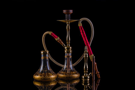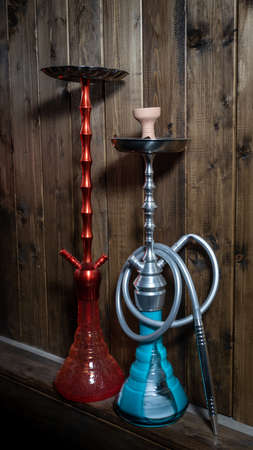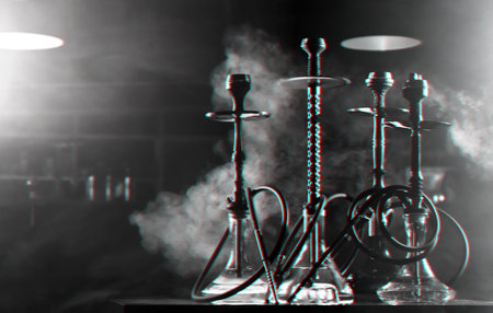 metal hookahs with glass flasks with shisha charcoals in smoke