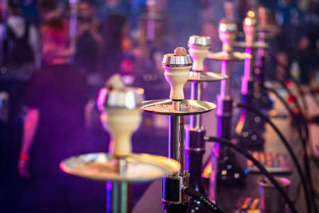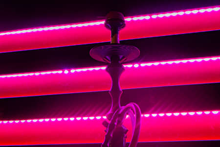 hookah bowl, shisha and coals close-up on a black background with colored lighting