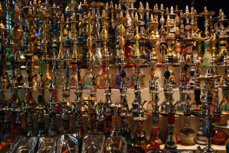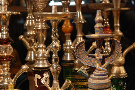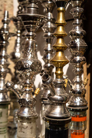 many hookahs with shisha glass flasks and metal bowlson the counter, Istanbul