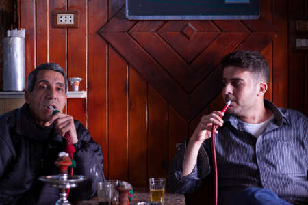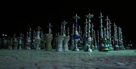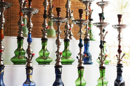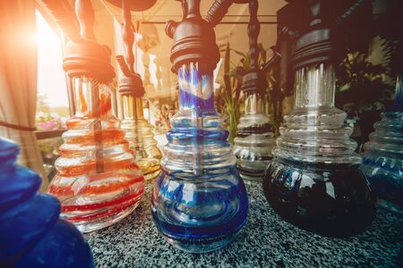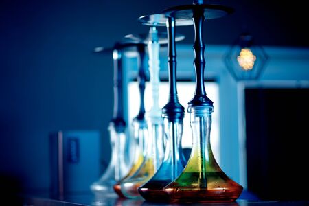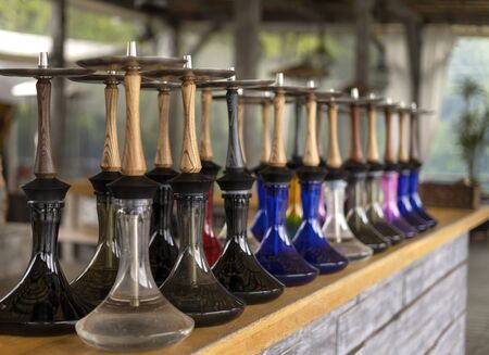 Arabic shisha, sometimes called hookah, waterpipes lined up on a bar for customers in a restaurant in an Arabic country.