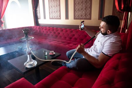 Man Smoking Turkish Hookah In The Cafe With Colorful Walls On Background and Taking Selfie With Phone
