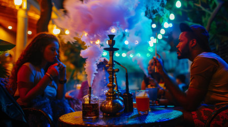 Colorful smoke swirling around a group of friends enjoying a hookah session at a vibrant outdoor lounge.