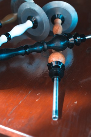 Crafted hand-made hookahs stands on a wooden stand in a hookah cafe. Many different craft hookahs stand together on a wooden pedestal