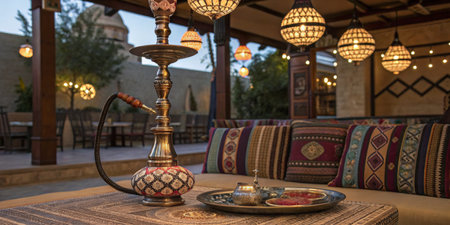 A beautifully arranged outdoor lounge area showcases a decorative hookah, plush traditional seating, and ambient lighting set against a serene backdrop during evening hours.