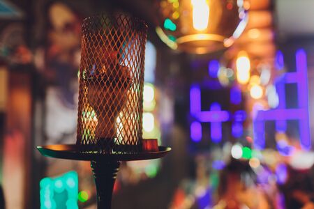 Shisha Concept. Hookah hot coals on shisha bowl with black background. Stylish oriental shisha with colorful lights. Selective focus