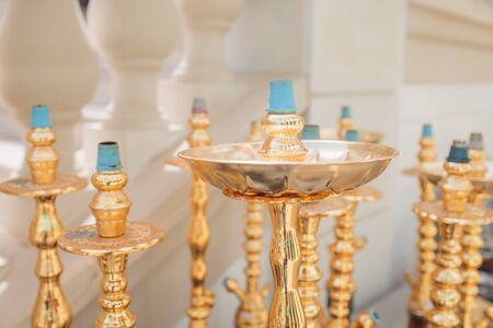 Crop details of gold decorated hookah or shisha, nobody, shallow depth. copy space