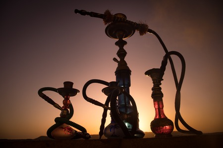 Hookah, traditional arabic waterpipe, direct sunset light, outdoor photo. Mountain background or Silhouettes of hookah on sunset background. Outdoor. Selective focus