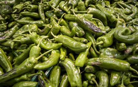Top down view of a large pile of fresh green chili peppers ready for roasting at a market in New Mexico.
