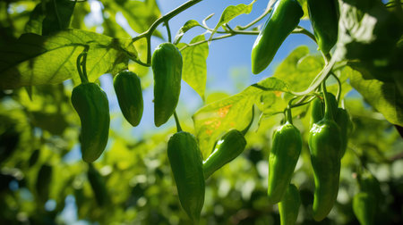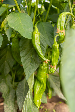 Japanese green bell peppers called shishito on farm under bright sunshine