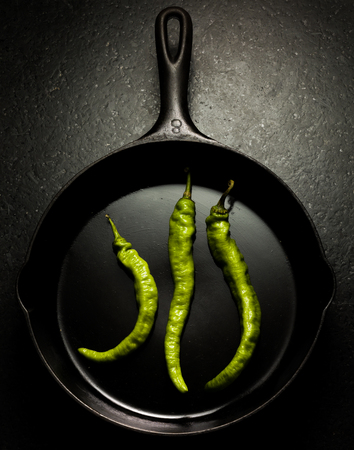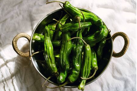 Green chilli peppers in a pan