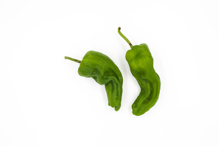 Two whole, fresh, Shishito Pepprs against a white background.