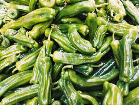 Close up background of fresh green padron hot chili peppers on retail display of farmers market, elevated top view, directly above