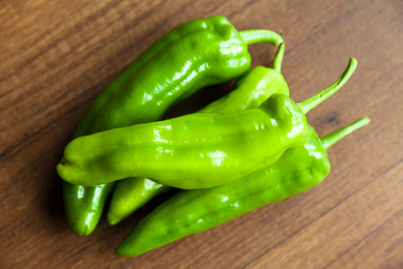 Green peppers on wooden table