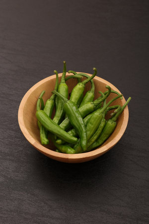Portion of Raw Pimientos on a rustic slate slab, selective focus, close-up shot