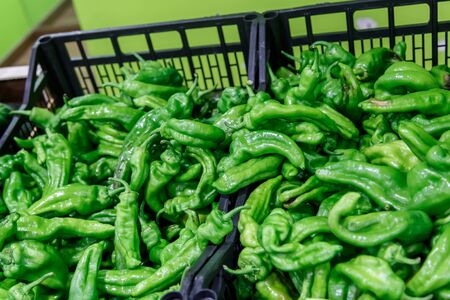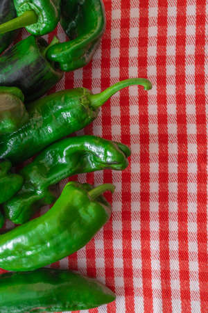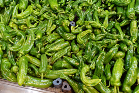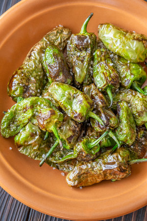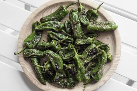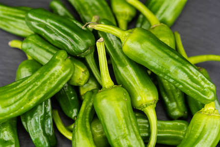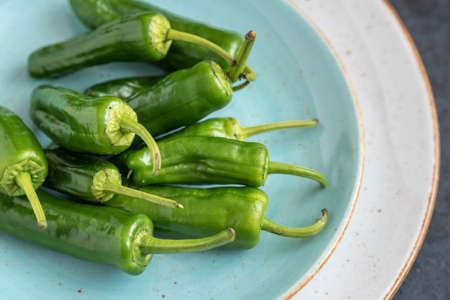 Group of green fresh chilli peppers padron on a plate