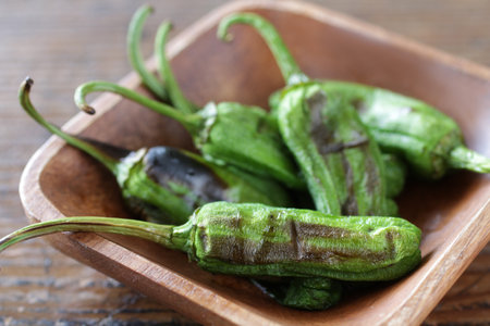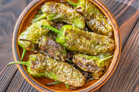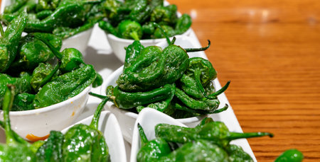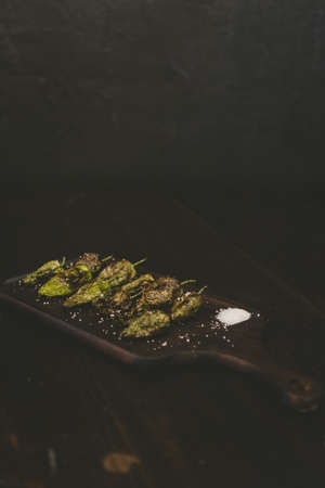 pimientos padron grilled spanish green chilli peppers tapas snack on plate in rustic santiago de compostela restaurant