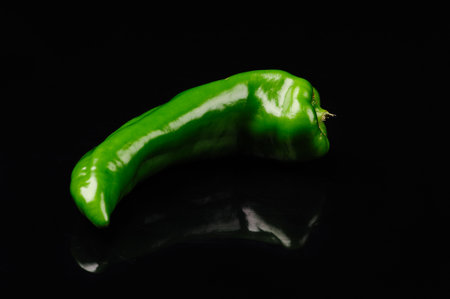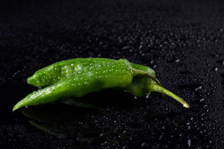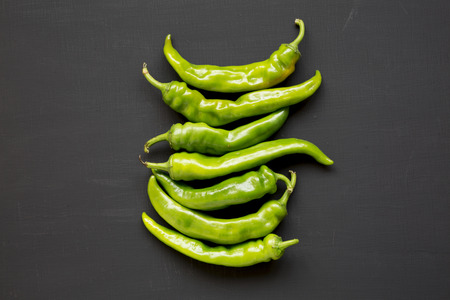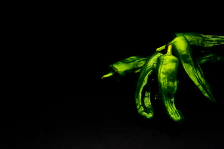 Green hot chili peppers on a black background.