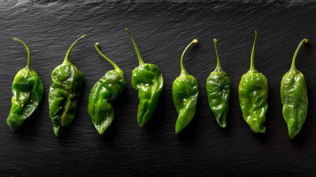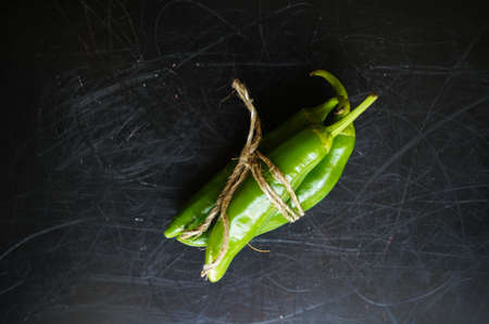 Portion of Raw Pimientos on a rustic slate slab, selective focus, close-up shot