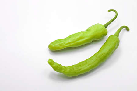 Two whole, fresh, Shishito Pepprs against a white background.