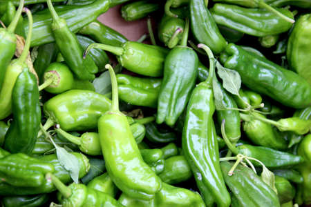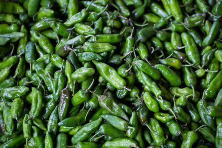 Top down view of a large pile of fresh green chili peppers ready for roasting at a market in New Mexico.