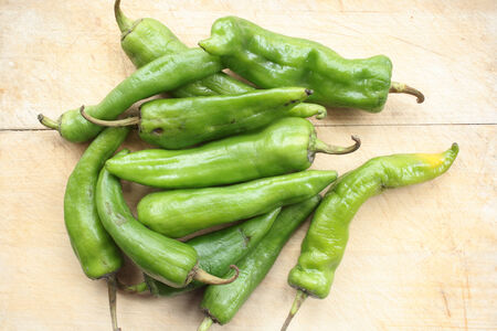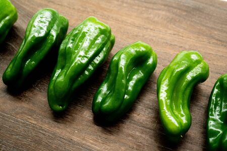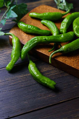 Shishito of summer vegetables placed on a wooden grain board background