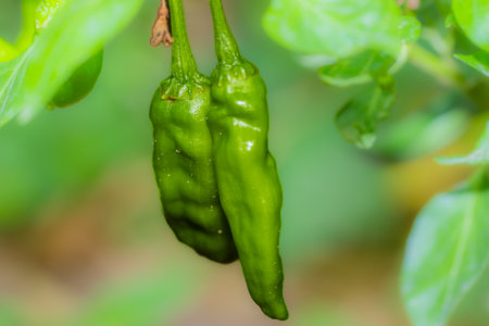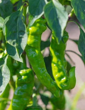Japanese green bell peppers called shishito on farm under bright sunshine