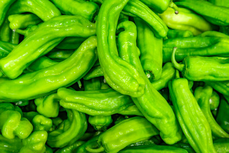 A bunch of green peppers are piled on top of each other. The peppers are all different sizes and shapes, but they all have a similar color. Concept of abundance and freshness