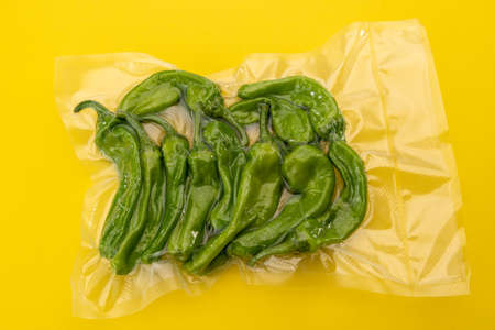 Friggitelli, Tuscan or Greek mild peppers, called also Pepperoncini in vacuum packed sealed for sous vide cooking isolated on yellow background in top view.