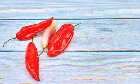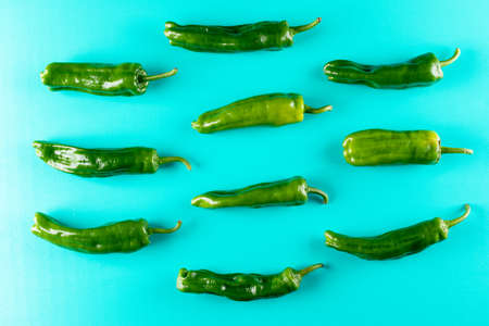 Fresh green chili peppers on a blank blue table