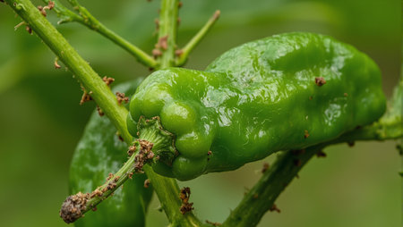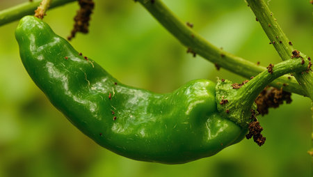 Macro shot of fresh green chili peppers growing on a plant, highlighting organic agriculture and the natural beauty of garden produce.