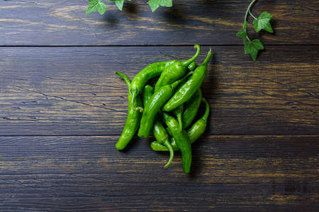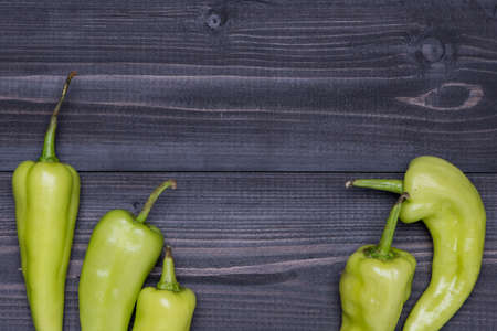 Green Peppers on dark wooden background, top view with copy space