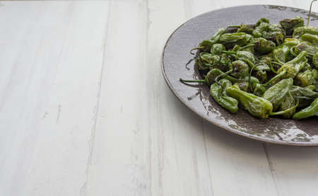 padrón peppers in a dark ceramic plate on white wooden background