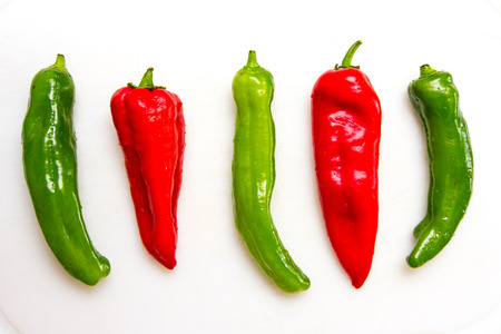 Small red and green peppers on white background