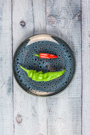 Red and green chili peppers on a colored plate, on a wooden background. Bitter peppers in different sizes. Vertical photo. Flat lay.