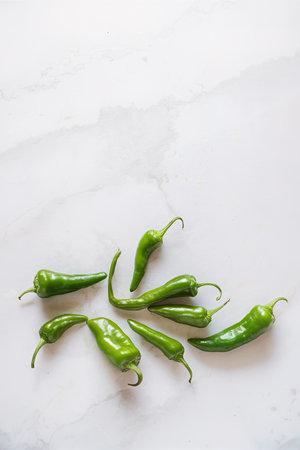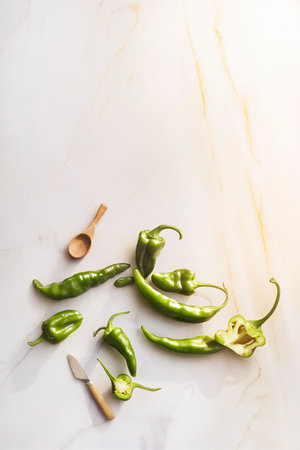 Green fresh hot peppers with one cut overhead shot on marble