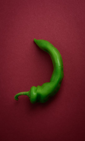 A long, curved green chili pepper on a rich burgundy background. Concept of heat, spice, and food.