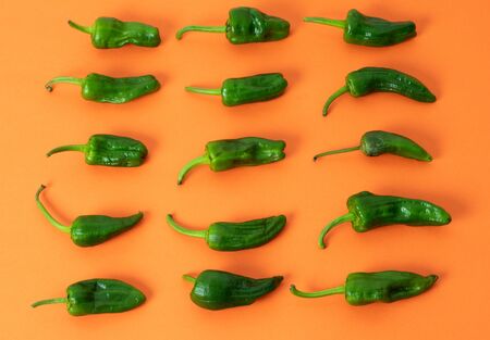 Flat lay green Padron peppers pattern on orange background. Top view