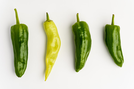Green peppers placed in line on white background. Isolated. Healthy food.
