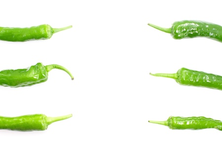 Fresh green chilies on white background