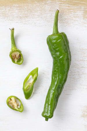 Green chili peppers on white wooden background. Shallow dof.
