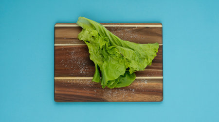 top view of lettuce on cutting board with salt on blue background