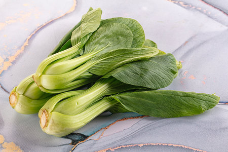 Fresh bok choy sits elegantly against a light marble background, showcasing its vibrant green leaves. This image captures the essence of healthy eating and fresh cooking.