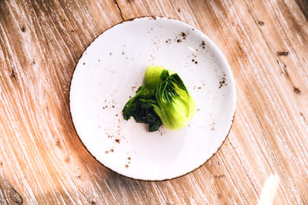 Cooked bok choy on a ceramic plate on a wooden background