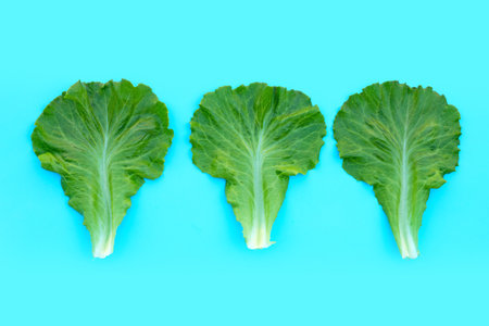 Lettuce leaves on blue background. Top view