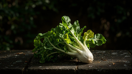 Fresh green endive leaves on stone bench in garden morning light illuminating delicate curled edges
