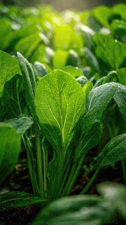 The Choy sum in spring, fresh green leaves, soft sunlight filtering, vibrant atmosphere full of vitality, natural textures, serene mood P.