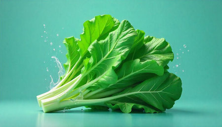 Fresh Bok Choy with water splash on a green backdrop