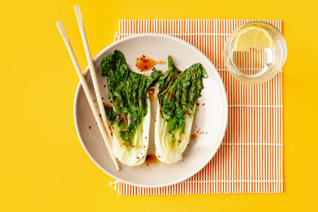 Plate of tasty stewed pak choi cabbage with soy sauce and glass of water on yellow background