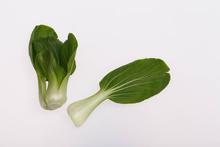 Healthy pak choi on a white background. Brassica rapa. Fresh pak choi - a leafy green Chinese cabbage lying on the left. Stock photo, place for text. Ingredient for cooking, diet and healthy eating.