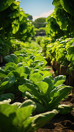 Fresh, vibrant lettuce growing in an organic farm under bright sunlight in a greenhouse setting